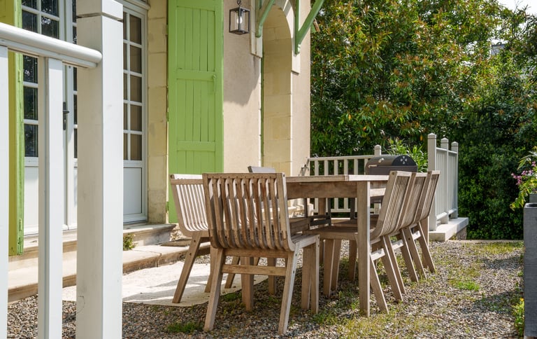 L’extérieur offre une terrasse surplombant le jardin, équipée d’un mobilier de jardin, d’un barbecue au charbon et d’une maison de jeux pour enfants.